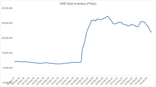 The marked rise in CME inventory reflected shifting risk management rules in a Covid world. Concerns over flights, logistics and interrupted production from various refiners outside the US meant that traders sought more inventory local to the CME to cover the potential to deliver into shorts. More recently, a recovery in physical demand elsewhere in the world has seen CME inventory stocks decline as gold flows out of those depositaries.
