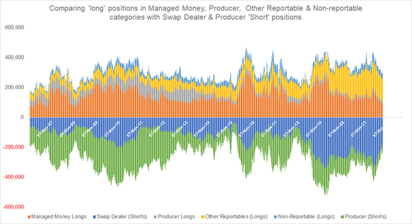 Comparing ‘Net’ positions of Swap Dealers, Managed Money investors, Producers, Other and Non-Reportable categories.