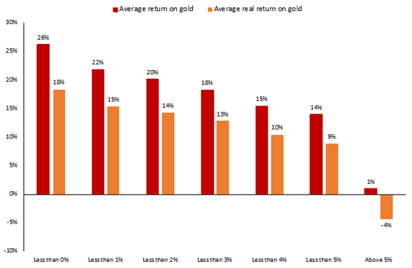 This can be seen in the chart below, which shows various real interest rate environments and the average nominal and average real return for gold on a rolling 12-month basis in those time periods.