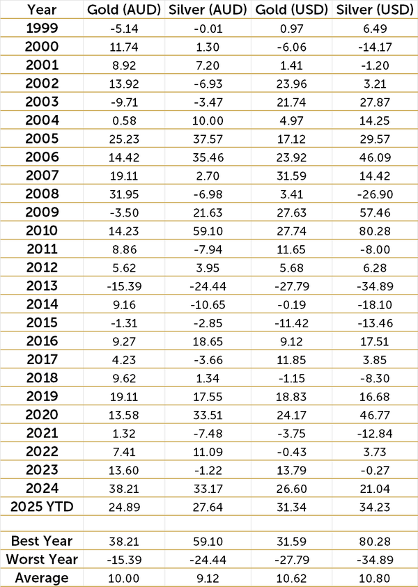 The standout years include 2010 for silver (+59.1% AUD, +80.3% USD) and 2024 for gold (+38.2% AUD, +26.6% USD), while 2013 marked the weakest year with declines seen across both metals.